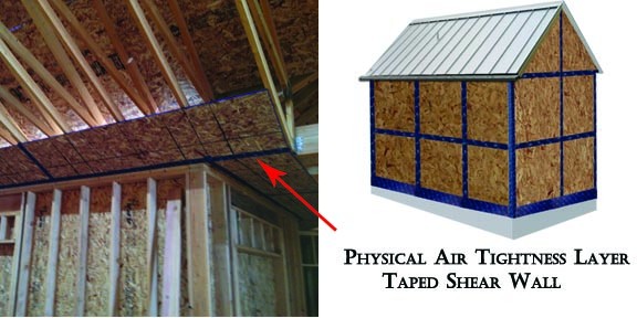 - Get Air-Tight from OUTSIDE IN. Foaming walls won't do it, spray gaskets seal on the wrong side too. To seal a building, you have to start with the exterior most substrate. Airtightness is achieved by wrapping the entire home in an air-tight barrier or shell. This may seem daunting, however, in construction, this is easily done by taking the existing wall and taping all the seams of OSB with #ForeverTape, special German tape. This is important because each OSB to OSB seam is an area where leakage happens. (The seam between the floor/basement and wall assembly also needs to be taped). At MainStream we have experimented with many tapes for this purpose. The tape that outperforms all is Tescon Vana tape. We call it our blue-jean tape for its texture and property of being airtight while vapor open, allowing moisture in the walls to dry out (made by Pro Clima and available here through MainStream). Our younger associates call it Forever Tape.