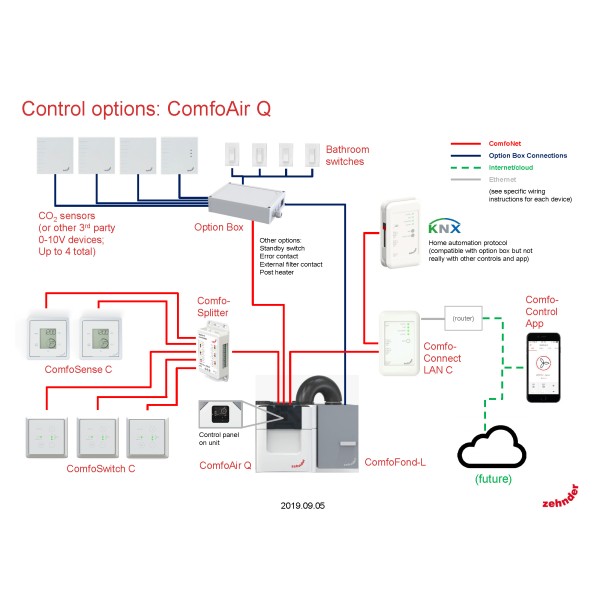 The ComfoConnect LAN C allows the user to completely control the unit using the Zehnder App on their smart device. Also included is the ComfoSense Controller, which is a wall mounted control unit that gives the user access to the system's functions. These systems are designed to replace the bathroom exhaust fans and the use of booster switches requires the Option box. Additional sensors are available such as